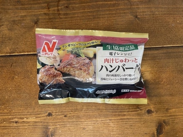 「電子レンジで!肉汁じゅわっとハンバーグ」は、冷凍でも本格的なジューシーさと手作り感を味わえるハンバーグです。