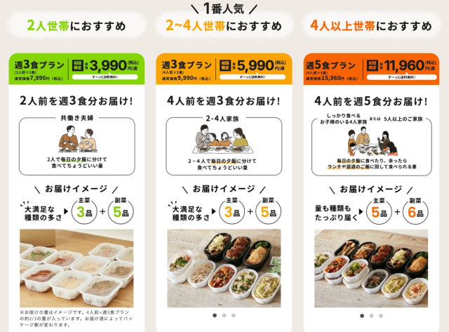 | プラン名 | 2人前×週3食プラン | 4人前×週3食プラン | 4人前×週5食プラン |